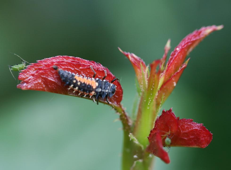 Se le infestazioni di afidi sono massicce le coccinelle non sono sufficienti (ti metto una foto ho che scattato ieri di una larva, così se le riconosci le lasci lavorare) e anche il piretro può non bastare se i parassiti sono semi-nascosti e lo spruzzo non ci arriva bene sopra. Io ho trovato un sistemico per uso non professionale sicuramente efficace in confezioni hobbistiche (vd. foto allegata)