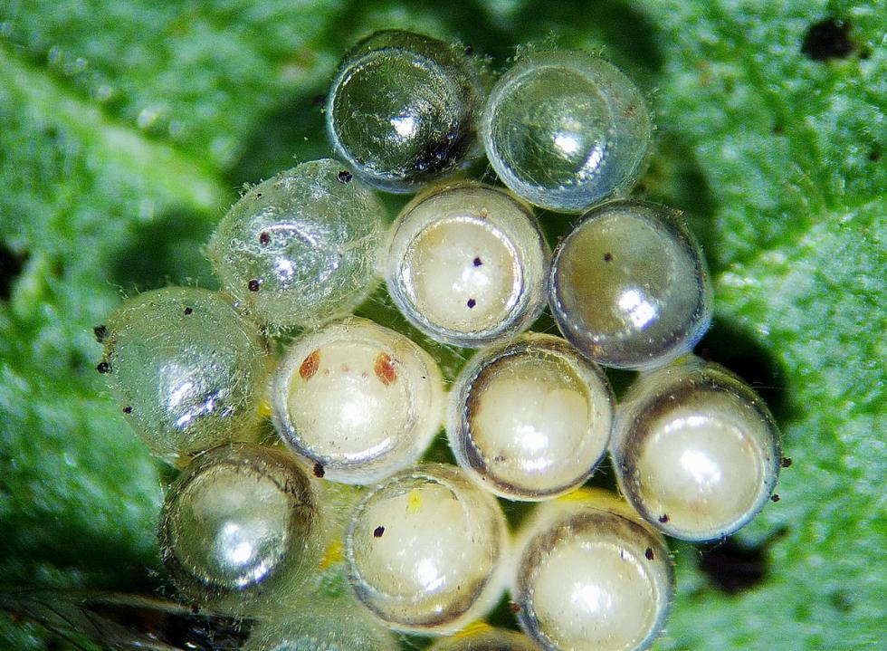 Occhio che non sia un avvisaglia di peronospora le foglie arricciate. Riguardo le uova non saprei, forse cimice?