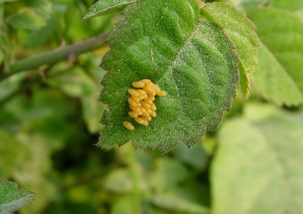 Io ti posso dire che le uova gialle facilmente sono di coccinellidi dal momento che dici di avere problemi di afidi (ovature simili appartengono anche a crisomelidi, per cui è d'obbligo una riserva). Per il resto non mi sento di pronunciarmi.