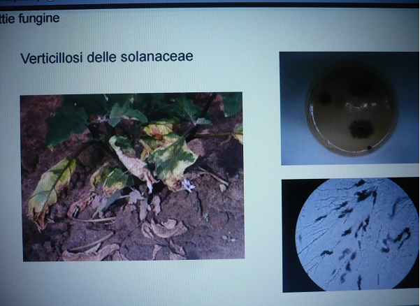 E' molto interessante questo pezzo tratto da un articolo de l'Informatore agrario dal titolo "Le avversità della melanzana": "Fra le malattie fungine una attenzione particolare deve essere riservata alle tracheoverticillosi provocate da Verticillium spp. (in particolare Verticillium dahliae) rappresentando la patologia più grave e diffusa che colpisce la melanzana in pieno campo e in serra, se non si provvede alla sterilizzazione del terreno, quando si raggiungono temperature di 24-25 °C e in serra temperature comprese tra 25 e 30 °C, sempre in presenza di elevati livelli di umidità del terreno. Il fungo sopravvive nel terreno a circa 1 m di profondità, su organismi morti, per tempi lunghi e si riproduce passando da un ospite vivo a un altro. Un mezzo di lotta preventivo consiste nell’adozione di ampie rotazioni, soprattutto nei confronti di altre solanacee, per l’elevata polifagia che caratterizza il fungo, ma soprattutto con l’utilizzo di piante di melanzana innestate su pomodoro o melanzana selvatica La verticillosi può manifestarsi con un decorso graduale, caratteristico della tarda estate, oppure in forma acuta con rapido avvizzimento del lembo fogliare e repentina morte della pianta. Nel primo caso i sintomi si presentano con iniziale leggera clorosi delle foglie più vecchie, localizzate nella parte bassa della pianta; la clorosi si estende successivamente alle foglie più alte e subentra l’avvizzimento di aree più o meno diffuse del lembo fogliare; infine le foglie disseccano e cadono per cui la pianta si presenta defogliata, riduce il proprio sviluppo e i frutti presenti rimangono di pezzatura ridotta. La pianta non muore, anzi reagisce emettendo ricacci alla base del colletto, l’apparato radicale non presenta sintomi particolari se non quello di essere più ridotto del normale. Indipendentemente dal decorso, sezionando radici e fusti si notano imbrunimenti che interessano i vasi legnosi e che possono estendersi fino alla metà e oltre dell’altezza della pianta. L’aggressione inizia a livello delle radichette e la penetrazione è favorita generalmente da microferite casuali, in particolare quelle provocate dalla presenza di nematodi; vengono interessati dapprima i vasi xilematici e successivamente quelli delle varie parti della pianta di cui determina l’occlusione. Esiste anche un’azione indiretta della presenza del fungo dovuta alla produzione di micotossine che aggravano ulteriormente le condizioni generali della pianta e che si concretizza con squilibri idrici e nutrizionali le cui dirette conseguenze sono i sintomi di avvizzimento fogliare. Nei riguardi del Verticillium sono rivolti gli sforzi della ricerca delle principali ditte sementiere per il conseguimento di resistenze genetiche, rese problematiche trattandosi di un carattere poligenico sostenuto da geni recessivi, o indotte con la tecnica dell’innesto della melanzana su varietà di pomodori resistenti o su varietà selvatiche di melanzana. "