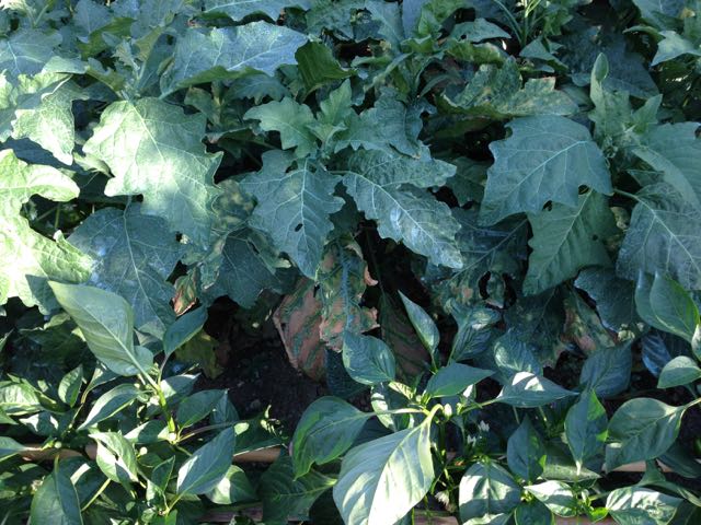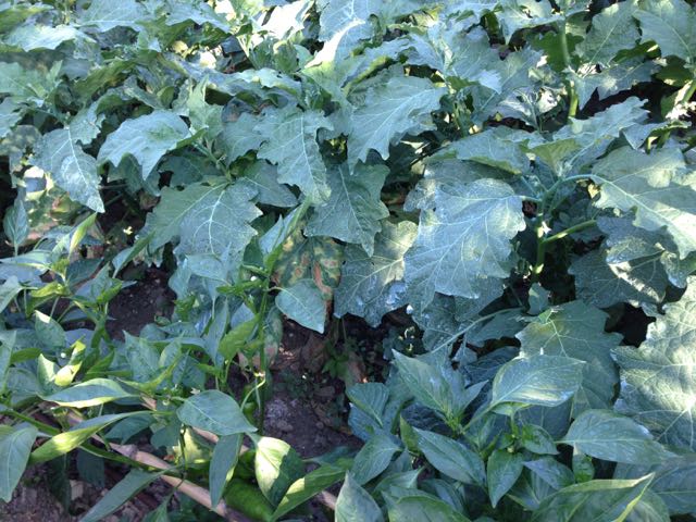 Si, Marcello, la foto che hai postato è esattamente come si presentano le mie melanzane, sembra perfettamente identica! L'anno scorso parlai con un coltivatore di melanzana rossa e gli chiesi quali patologie contrae questa varietà; mi rispose che talvolta presentano una malattia che "fa diventare le foglie come quelle del tabacco", che la malattia è dovuta a un agente infettivo presente nel terreno (non mi seppe dire quale) e che loro trattano versando una soluzione di ossicloruro di rame nel terreno. Allego una foto di una melanzana "classica" del mio orto che pure presenta alterazioni che non mi sono chiare. Allego altre 4 foto di veduta d'insieme delle mie melanzana rosse (o Solanum Aethiopicum). Comunque a me un agronomo ha detto che cure per la verticillosi non ne esistono anche se io sto trattando con i rameici. Grazie
