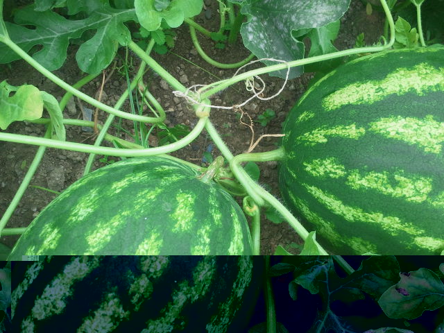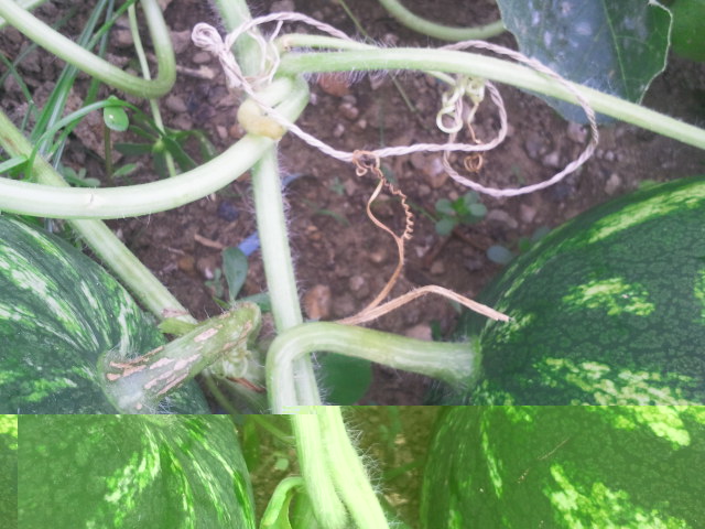 vi mando un'altra foto...ho contrassegnato in rosso il "viticcio" ancora verde e con la freccia un viticcio gia secco... le 2 angurie non sono sullo stesso "ramo" ma ci sono 2 rami uno sull'altro...non so se mi spiego...