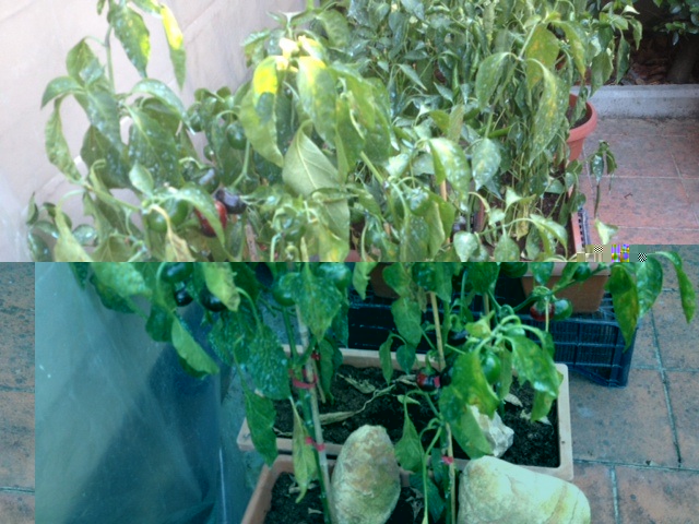 Da due giorni stó usando acqua del pozzo..( tutte le sere a lavoro prima di uscire riempio delle stagne ) e annaffio meno.. La situazione non migliora.. Ecco alcune foto.. Aiutooo!! Anche i peperoncini hanno foglie deboli e cadono di continuo.. Come mai? Allegato: