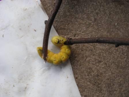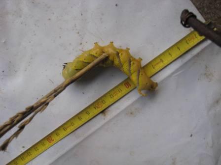 se non mi sbaglio è una larva di sfinge testa di morto... lo so perchè ne ho un esemplare adulto a casa e mi sono informato... la falena si riconosce perchè è molto grande e presenta una macchia a forma di teschio sotto la testa... è un po' paurosa in realtà anche se innocua