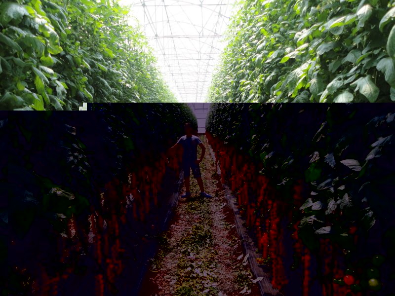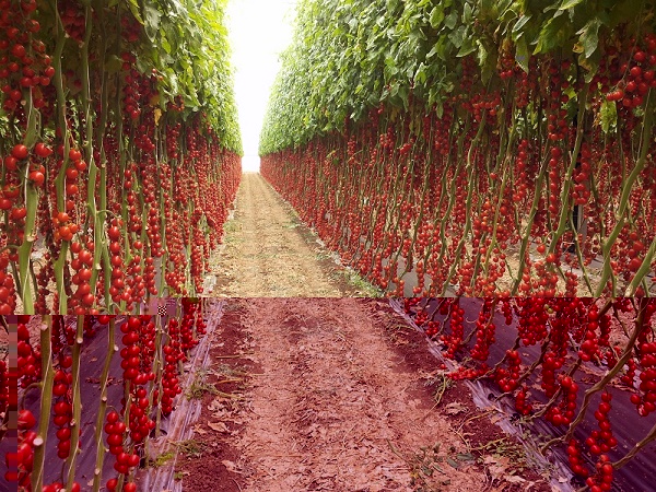 la colture in serra con fertirrigazione senza sbalzi termici che possono rallentare la crescita e la produzione, si possono ottenere piante molto produttive, la pianta di pomodoro non smette di crescere quindi una pianta che raggiunge i 10 metri e oltre nei vari mesi riesce a produrre molti chili di pomodoro. (esempio di colture in serra. vedi la freccia rossa l'ammasso che vedi è lo stelo dei pomodori che viene abbassato e spostato a destra e sinistra.)