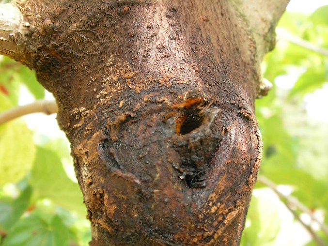 Potrebbe essere l'insetto Hypantria cunea, so che va matto per le foglie di morus nigra.......E' un lepidottero comparso in Emilia e poi diffusosi nelle regioni limitrofe........è un ipotesi però. Non dimenticare prima di chiudere il foro di disinfettarlo con del rame per evitare che il legno marcisca internamente.