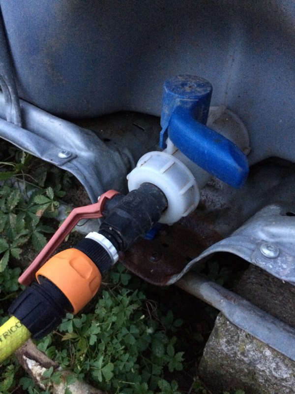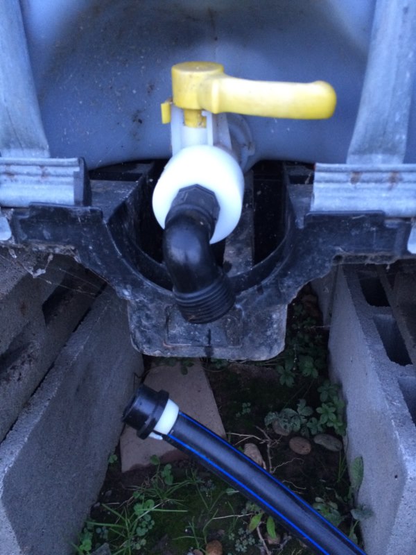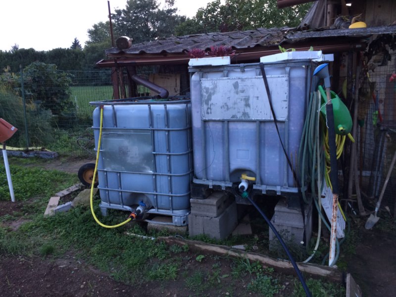 come vedete una è appoggiata a terra e l'altra è rialzata...perchè quella bassa la uso per raccogliere l'acqua dalle grondaie che poi con l'ausilio di una motopompa trasferisco in quella rialzata.....la cisternetta è appoggiata su dei blocchetti di cemento reperibili in tutti i centri di bricolage per poco meno di un euro, altezza dei blocchetti sovrapposti è 40cm in modo da avere il rubinetto a un'altezza di circa 60cm