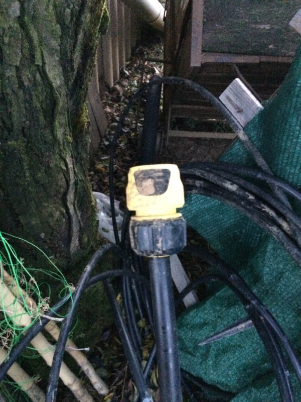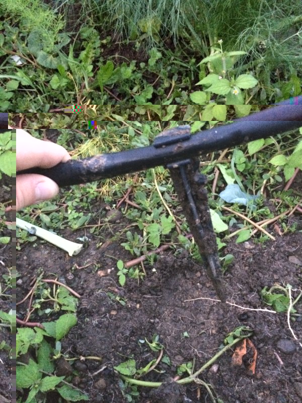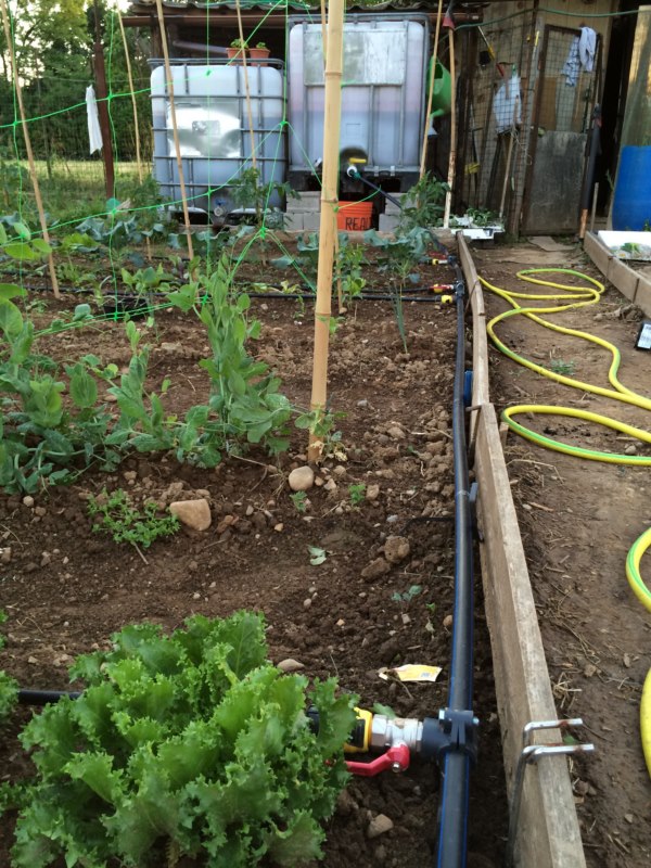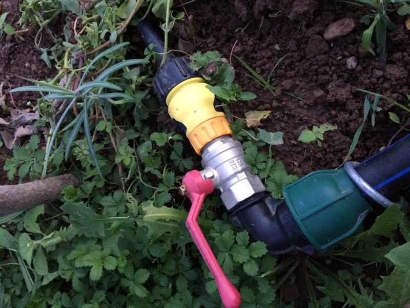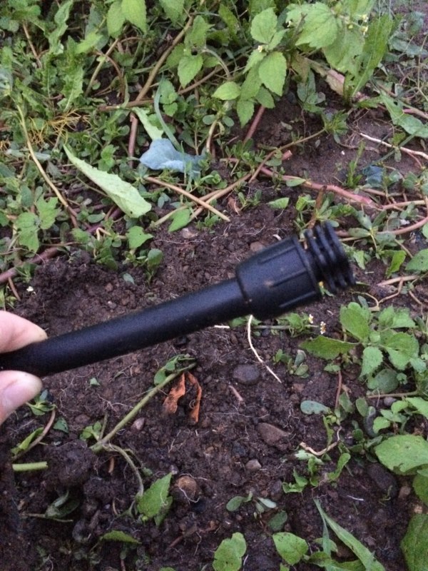 la foto di piatto così può trarre in inganno....il tubo reale di uscita parte dal numero 3 e finisce la numero 4,5 del metro....1,5cm circa è troppo poco!! da questo sistema l'acqua a tubo singolo esce piano piano...immaginatevi per alimentare l'intero impianto!!!......una volta che avete un bel buco di uscita largo il gioco è fatto....stendete il tubo madre (il mio misura 14,5mt) fissatela bene a terra con dei picchetti belli tosti e all'estremità mettere un rubinetto al quale potete attaccare un ala gocciolante