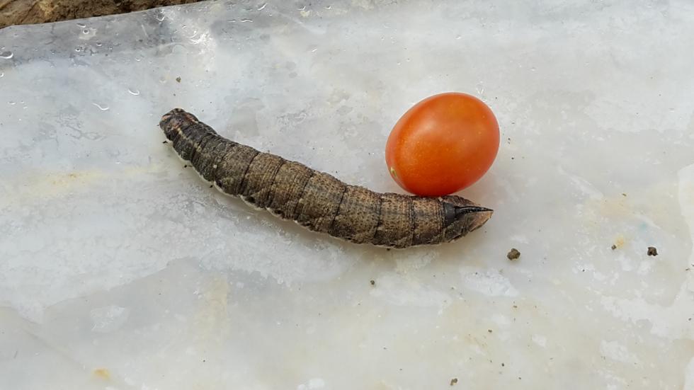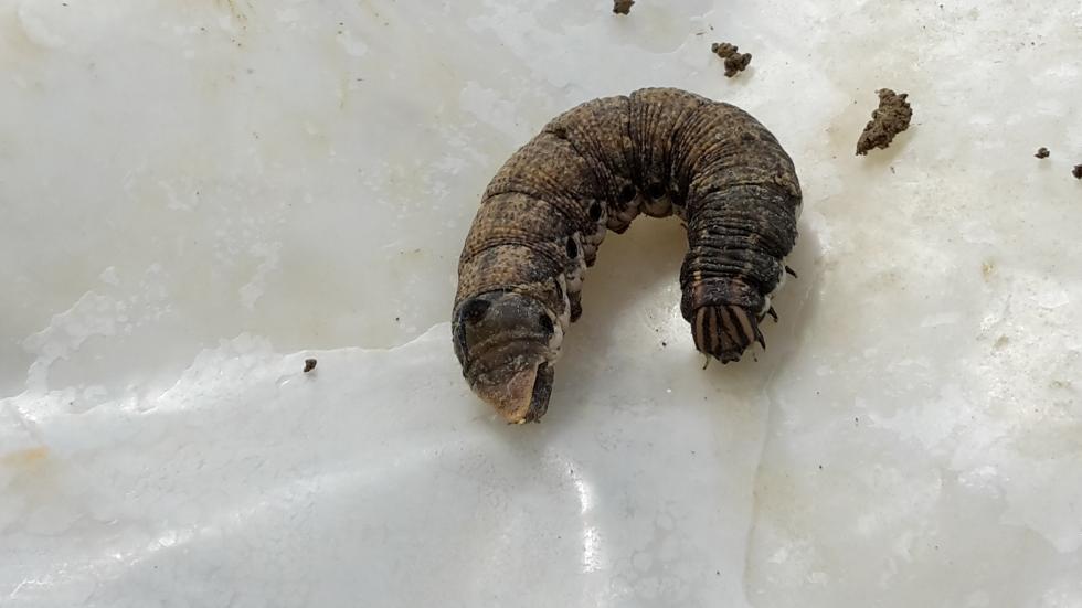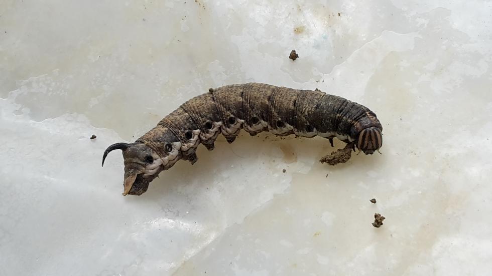 Direi una larva di sfingide (per via del cornetto nella regione anale) ma più avanti andrei solo per confronto (potrebbe essere quella del convolvolo che ha quelle striature sul capo, ma ci vorrebbe uno specialista). Ti metto ad ogni buon conto una foto da web del suddetto bruco (Agrius convolvuli)