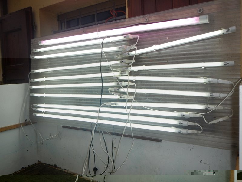 HO COSTRUITO I UN GERMBOX che fa anche da light box con una serie di lampade al neon bianche ad alta gradazione 8000 k messe nella ando le luci rosse e bluparte superiore del box sotto uno strato di sabbia ho messo delle resistenze per stabilizzare la temperatura con un termostato le luci le tengo accese 12 ore