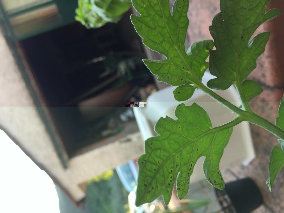 Mi interesserebbe osservare bene appunto la parte superiore per apprezzare sia la forma (tonda o irregolare) e aspetto (se concentrica con 'occhio' e con puntini interni = picnidi) della macchiettatura, sia se attorno c'è alone e di che colore: questo permetterebbe di indirizzare l'ipotesi tra una sintomatologia fungina (es. Septoria lycopersici) e una batterica (Pseudomonas syringae pv. tomato che compare prima sulla pg. inferiore, oppure Xanthomonas campestris pv. vesicatoria).