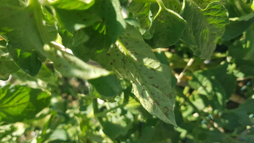 Macchiettature di forma irregolare in linea di massima non sono riferibili a un fungo, mentre potrebbero esserlo per i batteri (tipicamente sono scure, definite e circondate da un alone giallo); i sintomi peraltro possono variare in funzione della fase di sviluppo del patogeno e dell'età della foglia, per cui bisognerebbe seguire e avere ulteriori immagini (meglio se la foglia viene inquadrata da sopra).