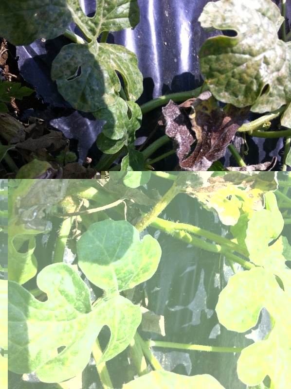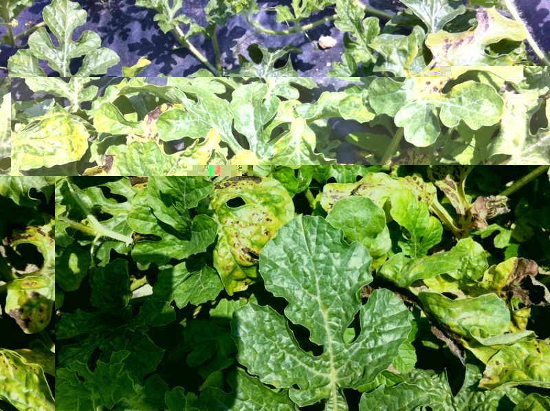 Le foglie di alcune angurie si stanno ammalando come da foto. Può darsi che si tratti sia di virosi che di crittogame? Se sì, di che tipo e quali possono essere i trattamenti indicati? Posto in una foto anche una foglia di zucchina, appena colpita. Grazie e buona domenica