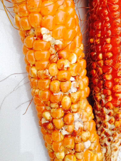 se il grano è rosicchiato e il tutolo bucato è la piralide, un vermetto che si nutre dei chicchi ed è diffuso se non si tratta chimicamente, non cambia nulla c'è solo qualche chicco rovinato se invece fa un po' di muffa è per l'umidità