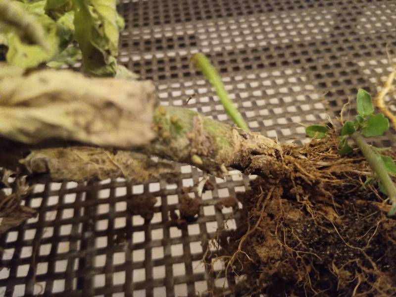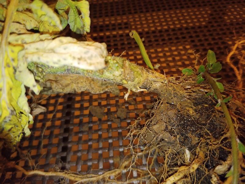 La parte terminale è annerita ed esternamente molle. La parte centrale è più legnosa e scoperta nelle zone appena interrate e rivolte verso il basso (per vederlo bene devo eradicare la pianta)