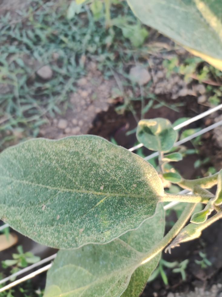 Dalla foto non riesco a capire se si tratta di una patina; se così effettivamente fosse potrebbe trattarsi di mal bianco anche se mi rimangono molti dubbi in quanto su melanzana ci va in particolare un oidio che si chiama Leveillula taurica che però si sviluppa prevalentemente all'interno del mesofillo e sporula attraverso gli stomi sulla pagina inferiore.