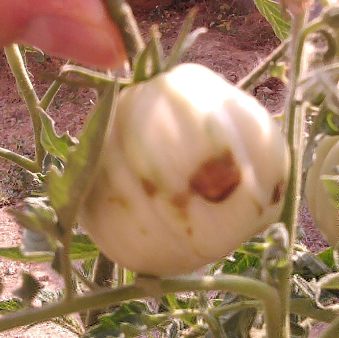 Ciao a tutti. Vi metto due foto degli stessi pomodori che ha fatto ieri mio nipote, spero si veda più bene. Ho capito che quella del pomodori è una coltivazione molto complicata, tra ragno rosso, cimici, nottua, tuta absoluta e peronospora pare di stare allo zoo. A malincuore poi taglierò quei pomodori per guardarci dentro, e vi farò delle foto così potete dirmi qualcosa di più.