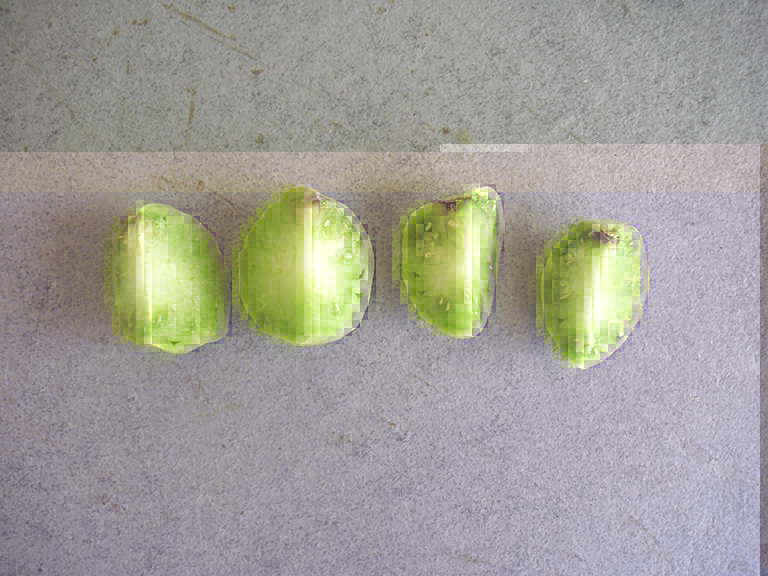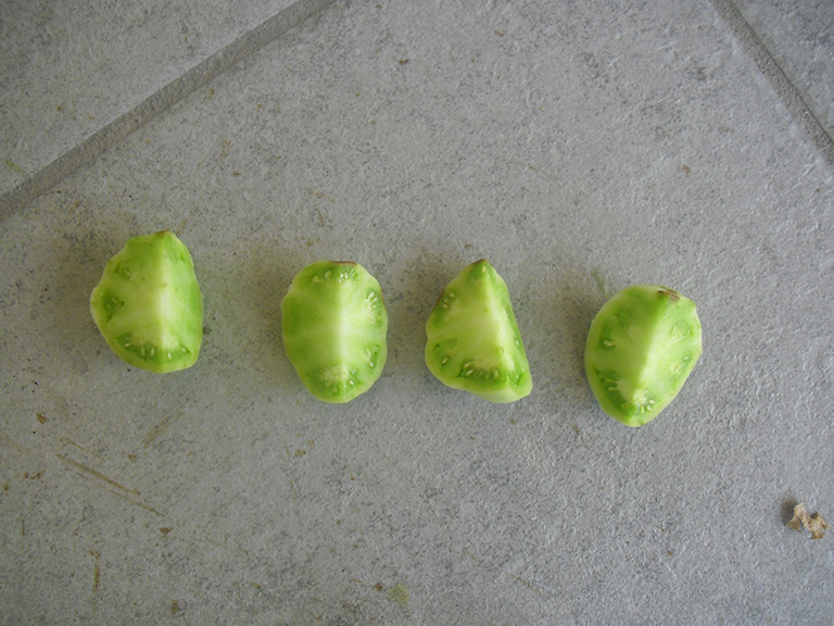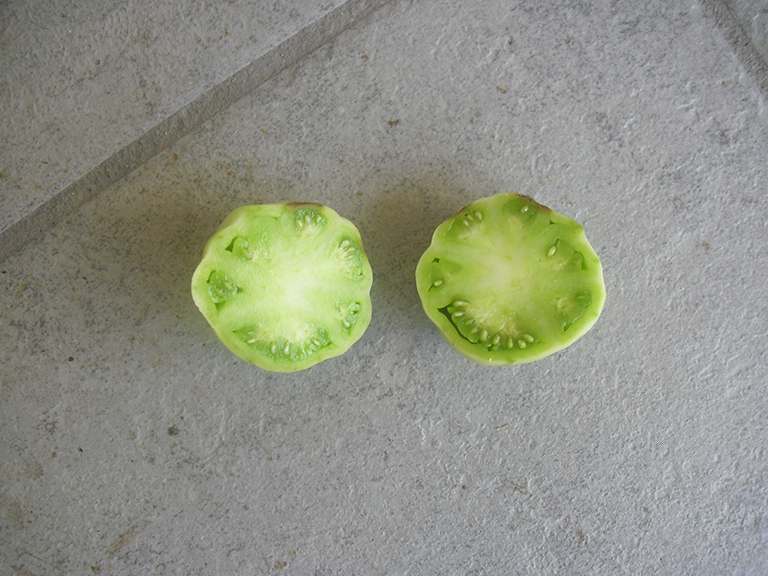 Vi ringrazio per le risposte. Oggi pomeriggio mi sono divertito, si fa per dire, a fare il medico legale a quei due pomodori che vi avevo fatto vedere in foto. Il risultato è quello che potete vedere dalle foto. Non mi sembra di vedere nulla di particolare, la cicatrice e quella specie di tacca marrone intaccano solo la superficie del pomodoro e non l'interno, che risulta bello compatto e privo di scavature. Questo è quello che vedo io, magari un occhio più esperto e più abituato sa cogliere qualcosa, nel caso fatemi sapere. Grazie.