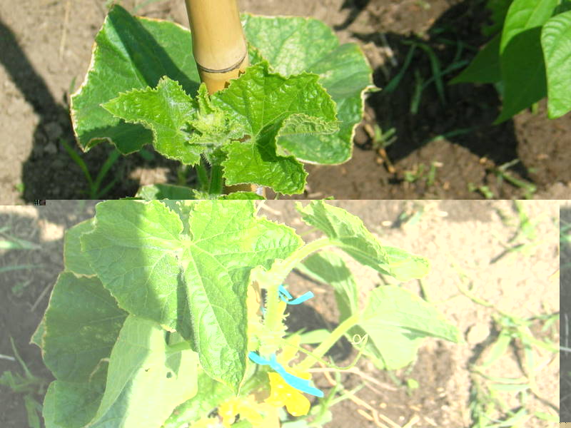 Salve, è il primo anno che provo a coltivare cetrioli e oggi ho notato su una pianta di cetriolo già in fiore queste foglie strane, mi sembra qualche cosa di pericoloso anche se sembra in buona salute. Da 2 giorni siamo tornati ad una forte escursione termica, di giorno 20-23 gradi di notte 9.