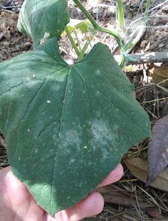 Questa in foto è l'unica foglia 'gravemente' colpita,le altre foglie di altre piante di cetriolo,solamente alcune presentano le prime macchioline bianche.