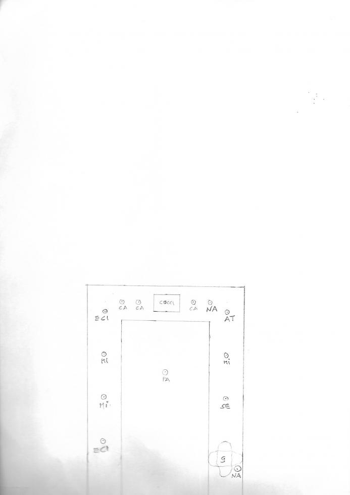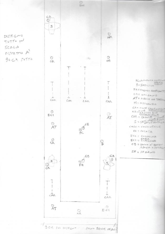 Ora allego lo schema del posizionamento degli ortaggi nel mio bancale secondo le regole della sinergia, rispettando le consociazioni il più possibile e le distanze tra le piante e mettendo un po di ortaggi diversi in modo da avere un raccolto un po' vario per le esigenze standard. Chiedo agli esperti o sperimentatori del sinergico se va bene o se vi sono delle correzioni da fare?