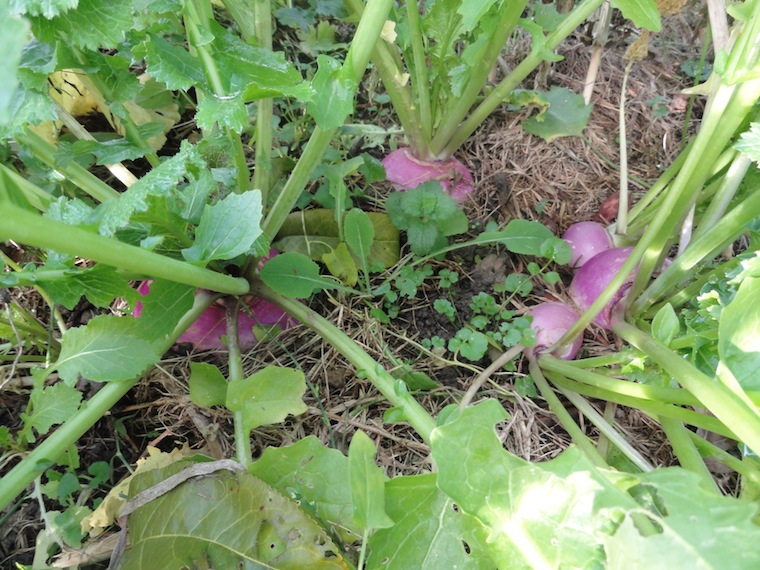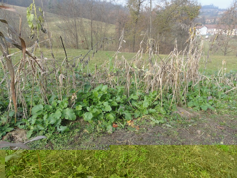 Quelle che seguono sono le foto delle rape seminate a san bartolomeo (come si usa qui) tra il mais: sono cresciute molto bene prevalentemente nella parte in cui la pacciamatura depositata era composta da fieno ultra maturo, lungo e secco in piedi, invece nella metà pacciamata con sfalcio verde e corto erano sparute; l'insegnamento che traggo (per l'ennesima volta!) é che il seme tra gli steli secchi é sceso fino a terra o il giusto per germogliare, mentre é rimasto sulla superficie compatta creata dalla massa fresca che seccando é rimasta schiacciata (e che la prossima volta scuoterò prima e dopo aver seminato per essere sicuro che il seme si sia ben Insediato). Pian piano proseguo. Buona serata.