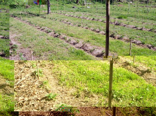 Un foro per la semina, manichetta per irrigazione e subito pacciamatura. Sfalcio del prato con falciatrice a barra e rifinititura con decespugliatore vicino la fila, il materiale tagliato per rinnovare la pacciamatura. Il gioco è fatto e attendiamo la maturazione.