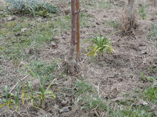 Salute a tutti, qualche notizia fresca dal campo (continua da qui). GennaioPiantati due mandorli, un tuono e un ferragnes, il primo per celebrare la nascita del nostro primogenito (con qualche mese di ritardo...ma mica potevo piantare un mandorlo a ferragosto), l'altro per fargli compagnia ("ca unu sulu non è bono mancu a mangiari" mi ha raccomandato il gentilissimo fornitore siculo). Oltre la divagazione personalissima, cito il fatto per sottolineare che sono stati piantati in consociazione con degli alberi di ulivo pre-esistenti, come da tradizione antica. L'aglio solamente appoggiato a terra sotto la pacciamatura pare che abbia completamente attecchito e cresce bene. Se Dio vuole, abbiamo finito di stressare un caro amico che legge e che salutiamo  per la fornitura di questo superfood. Le aiuolone sono state divise in aiuole doppie regolari, ognuna lunga 10 m e larga 120 cm. Si seminano fave, piselli, ceci. Qui l'immagine di un'aiuola con la pacciamatura rivoltata (notare il terreno sottostante che sembra zappato e concimato...e invece ha fatto tutto Madre Natura) per la semina dei ceci:  E durante la semina, sopresa! Una cipolla Fukuoka che più Fukuoka non si può (avevo abbandonato uno scarto di cipolla vicino a dove feci l'esperimento delle patate):  Una settimana dopo la semina, fine gennaio circa, complici le abbondanti piogge, le fave hanno già germogliato e stanno agganciando le radichette al suolo (foto troppo scura, non la metto neanche). Ce la faranno, considerato che le aiuole nelle quali sono state piantate sono state fatte con lo sfalcio grossolano di un roveto (mea culpa, ignoravo che i rovi andassero sminuzzati finemente)? Alla prossima!