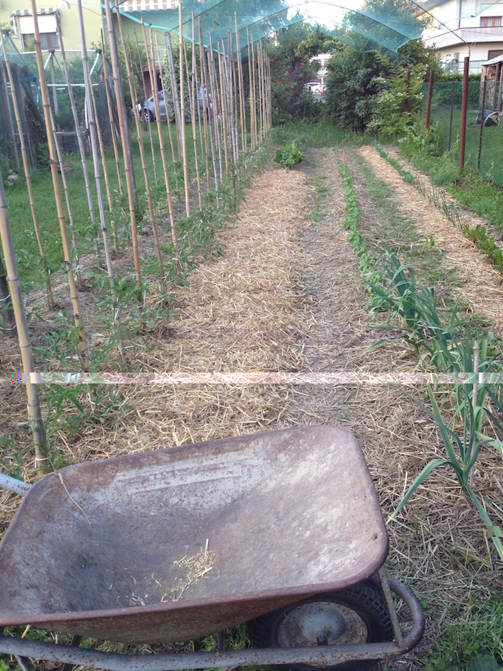 Il primo principio del metodo Fukuoka si basa sulla non lavorazione del terreno e molti si pongono il problema della semina diretta. Allora vorrei ricordare gli obbiettivi principali delle lavorazioni: creare una struttura artificiale del terreno ed eliminare la competizione delle "infestanti". Ma questo si può ottenere anche con la non lavorazione e in modo più stabile ed economico, ma come??? La gestione di un prato polifita permette lo sviluppo di una biocenosi del terreno utile a creare una struttura stabile che permette lo sviluppo ottimale della nostra coltura. La pacciamatura riduce la competizione nei momenti più difficili della crescita delle piante: emergenza e primo sviluppo. Così si crea una coabitazione tra prato stabile e file destinate alla coltivazione di specie più esigenti, utilizzando il materiale di sfalcio per la copertura e concimazione. Per esempio: nella coltivazione di piselli o fagiolini innanzi tutto dobbiamo scegliere se parliamo di piante nane o rampicanti. La pacciamatura va predisposta e rinnovata alcuni mesi prima, meglio se fine estate dell'anno precedente. Fino ad arrivare poco prima della semina con non più di 10 cm di materiale che poi andrà aggiunto man mano che la coltura cresce senza coprirla. La semina può essere eseguita direttamente sulla pacciamatura con questo splendido attrezzo che uso dalle patate ai fagiolini, al trapianto di piantine (pomodoro, zucchine, peperoni, etc.) Se invece parliamo di semi più piccoli come lattughe, carote, etc. dobbiamo pacciamare con molta biomassa e per molto tempo, togliere tutto, seminare, aspettare l'emergenza e iniziare a pacciamare con materiale molto fine aumentando la grandezza man mano che le piante crescono.