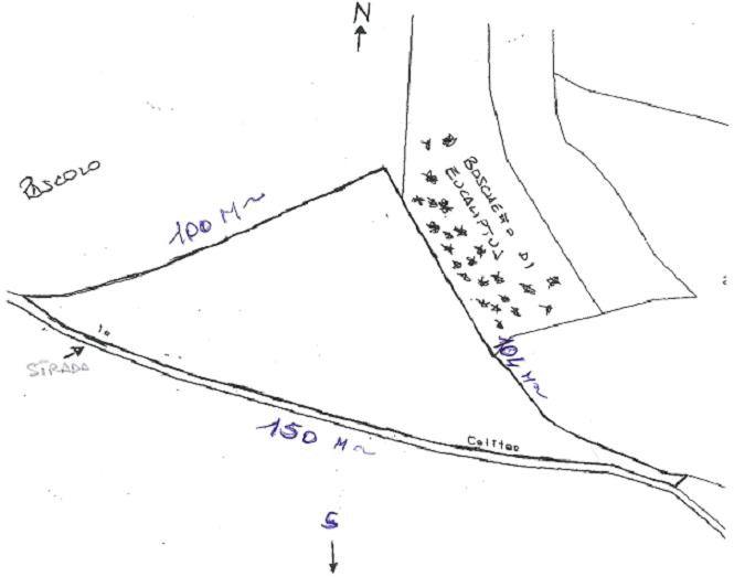 queste, come richiesto da Pallinof sono le misure del terreno con la strada di accesso che lo costeggia a Sud. Il terreno che è stato lasciato libero dalle pecore ha poca erba ma molti cardi selvatici. Ho iniziato a sfalciarli sabato scorso con un decespugliatore ma ....era fermo da un pò e si è bloccato quasi subito. Pensavo di usare tutto quel ben di Dio come pacciamatura....faccio bene ? Aspetto i vostri consigli ... sopratutto quelli di Pallinof. A presto e un saluto a tutti Ciao  Arnaldo