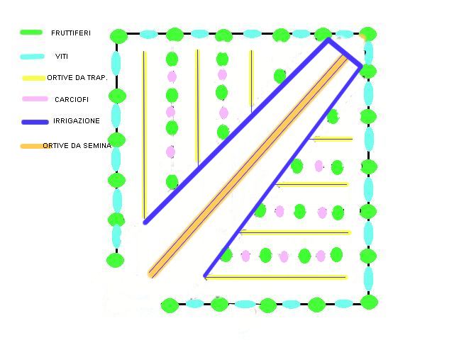 Una bozza di possibile sistemazione con misure approssimative da sviluppare nel dettaglio. Ripeto è molto importante fissare obbiettivi chiari da raggiungere, iniziando a piantare dei pali dove andranno sistemate nel tempo le diverse piante.