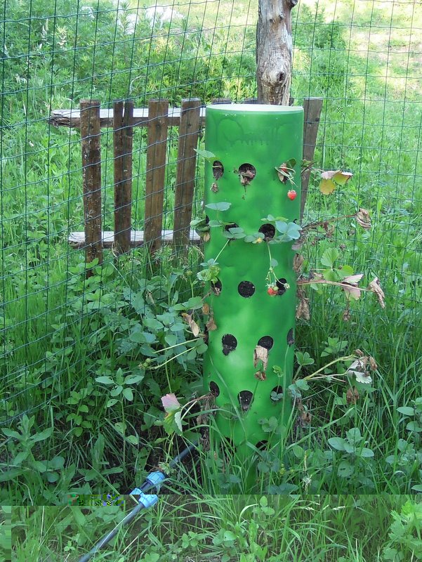 è costrito con un tubo di plastica grosso a cui ha fatto distanziati tanti fori circa da 10 cm in cui ci si infila le piantine di fragole..
