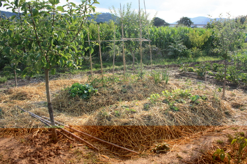 Bancale della foto precedente visto dall'altro versante. Nonostante la pacciamatura qua e là crescono erbe spontanee, soprattutto portulaca, tarassaco ed altre che non conosco. Io le lascio crescere abbastanza, recidendole quando sono cresciute un pò, senza estirparle ma lasciando le radici interrate.