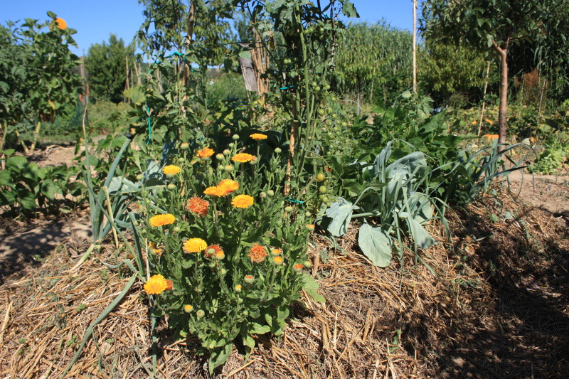 Commento file: Bieta, coriandolo, melanzane, fagiolini, porri, pomodori e calendula sullo sfondo