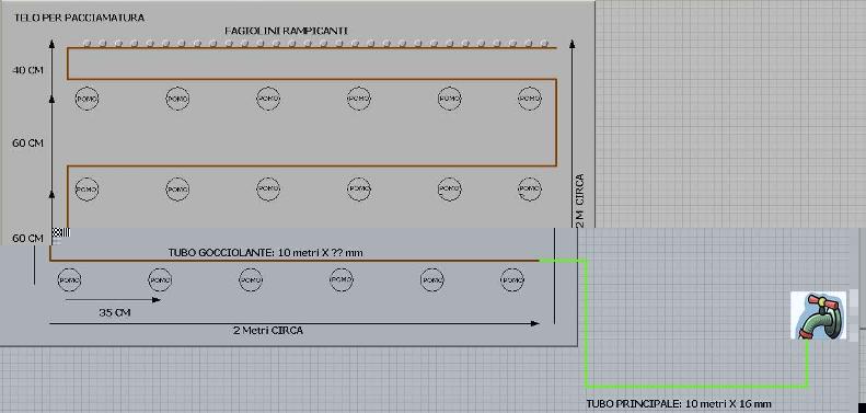 Come potete vedere il tubo principale (in verde) è lungo circa 10 metri ed ha un diametro di 16 mm (questo ce l'ho già). Tramite raccordo ad esso è collegato il tubo gocciolante lungo anch'esso 10 metri e con gocciolatori incorporati posti a distanza di circa 30-35 cm l'uno dall'altro. Mi consigliate, data la lunghezza dei tubi (20 metri in tutto) di prendere un tubo gocciolante con diametro più piccolo di quello principale o va bene anche da 16 mm come quello principale? L'acqua è presa da un comune rubinetto da giardino (dunque ha pressione). Mi chiedevo se l'acqua ce la fa ad uscire da tutti i gocciolatoi. Inoltre visto che i fagiolini sono a distanza più ravvicinata tra di loro mi consigliate anche di prendere un tubo gocciolante con i gocciolatoi più vicini tra di loro o va bene anche lo stesso che vorrei utilizzare per i pomodori?