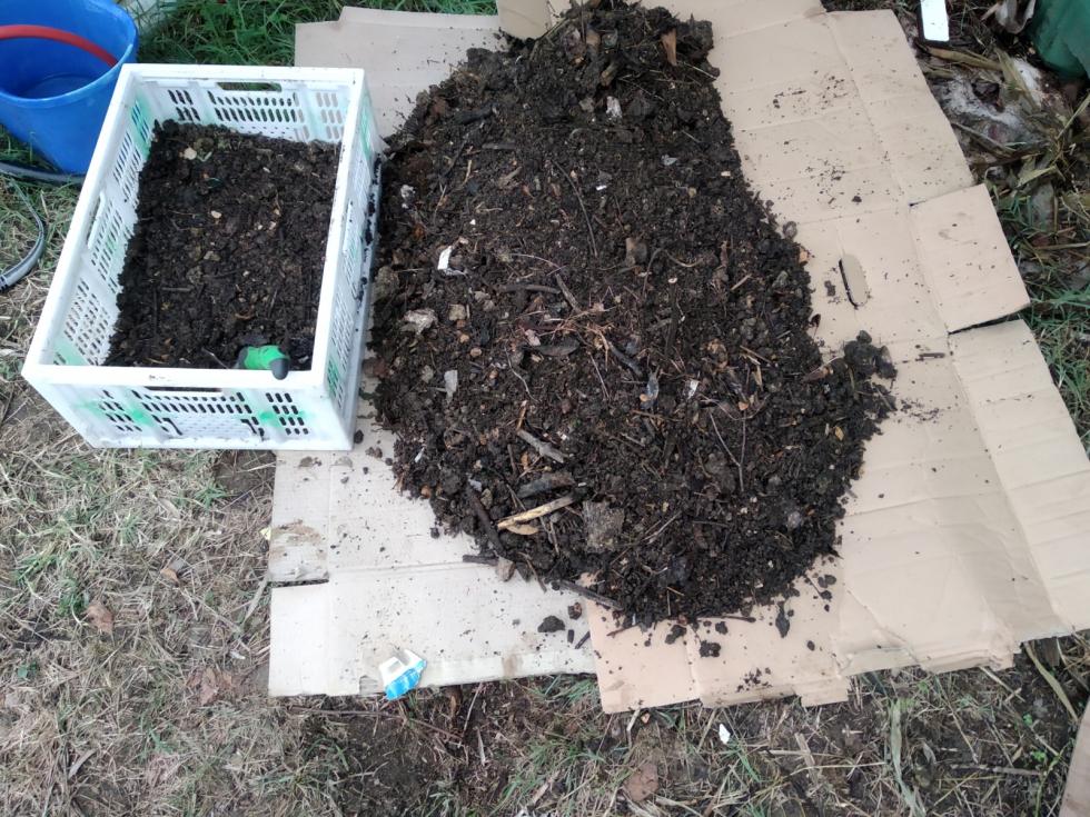 Invece da poco tempo ho iniziato un nuovo cumulo da compostare usando quei cassoni grandi per le olive che hanno nei mulini. Questa volta invece di aggiungere materiale poco alla volta, ho accumulato quantità più grandi di materiali diversi divise tra loro, poi ho iniziato a fare dei strati alternati mettendo anche terra e compost maturo. Con piacevole sorpresa il nuovo cumulo ha iniziato già a scaldare molto, forse anche perché questa volta ho posto attenzione a mantenere sempre un corretto contenuto di umidità.