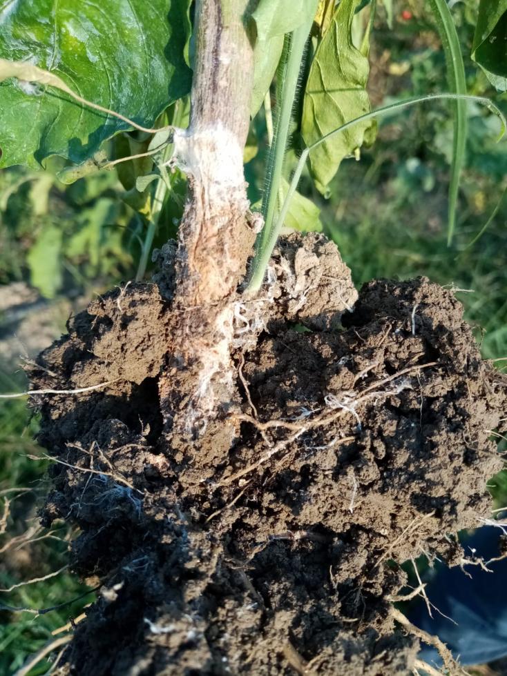 Questa invece è una pianta di peperoni che sta appassendo, si nota la patina bianca sul colletto all'altezza del terreno, e qualche filamento sulle radici e terreno. Allegato: