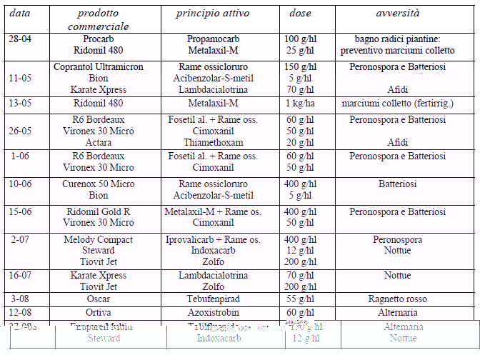 ti reinvito a nn fare allarmismo mediatico quello che tu posti è un calendario di lotta di una prova sperimentale fatta presso l'azienda sperimentale del ex-Centro Cirio ricerche e quindi nn una coltivazione ordinaria della Cirio relativamente ai controlli sui prodotti agricoli oggi un agricoltore che vende ad una piattaforma commerciale deve accompagnare la sua merce da un certificato redatto da un tecnico abilitato che attesti i trattamenti che il prodotto ha ricevuto.Successivamente a campione sono fatte analisi da parte degli acquirenti o presso i mercati generali di destinazione. Relativamente alla vendita di prodotti nn consentiti purtroppo specie dalle ns parti c'è una disonestà diffusa e questi casi andrebbero prontamente segnalati alle autorità giudiziarie