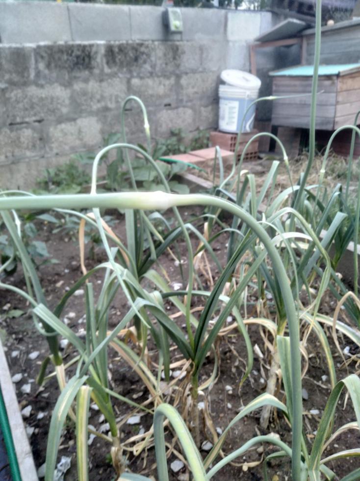 ok, quelli sono gli scapi fiorali, spezzali alla base e, come detto, puoi consumarli, sono gradevoli con un delicato profumo di aglio, poi lascia crescere l'aglio fino a che le foglie sopra non sono più verdi