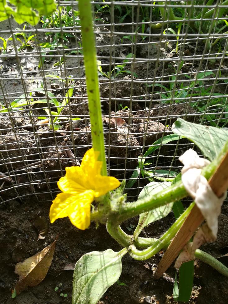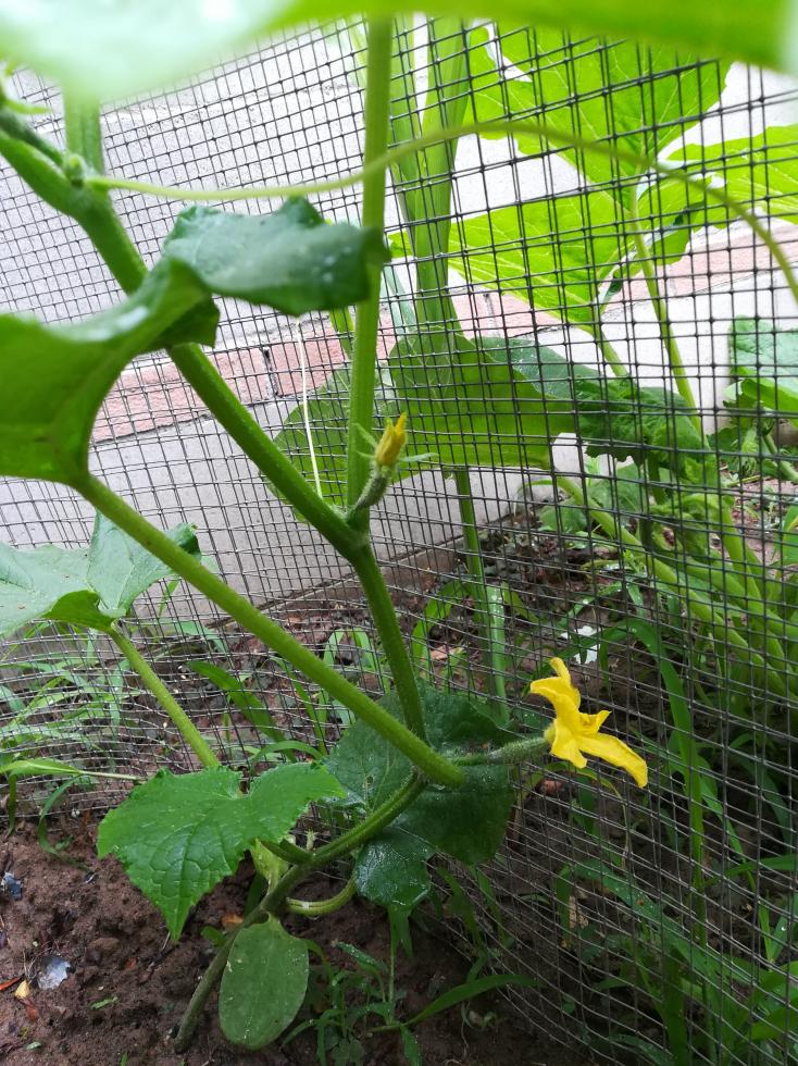 Eccomi, ho fatto le foto ai cetrioli, la seconda mostra il solo fiore maschile che hanno al momento, tutti gli altri sono fiori femminili, spero che oggi sia andata qualche ape, o seccheranno tutti. Scusate ma i cetrioli stanno in un angolo dove è difficile fotografarli, le zucche stanno prendendo il sopravvento e ho creato una barriera/arrampicatoio con una rete.