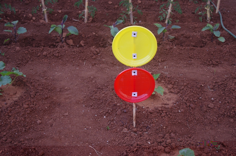 Ciao, Trappole piazzate allego alcune foto. Trappole auto-costruite con piatti di plastica colorata e colla topicida ... visto che c'ero mi sono "sfiziato" con i colori. Spero di non aver fatto qualcosa che allontani gli insetti a causa dei colori che ho messo insieme.