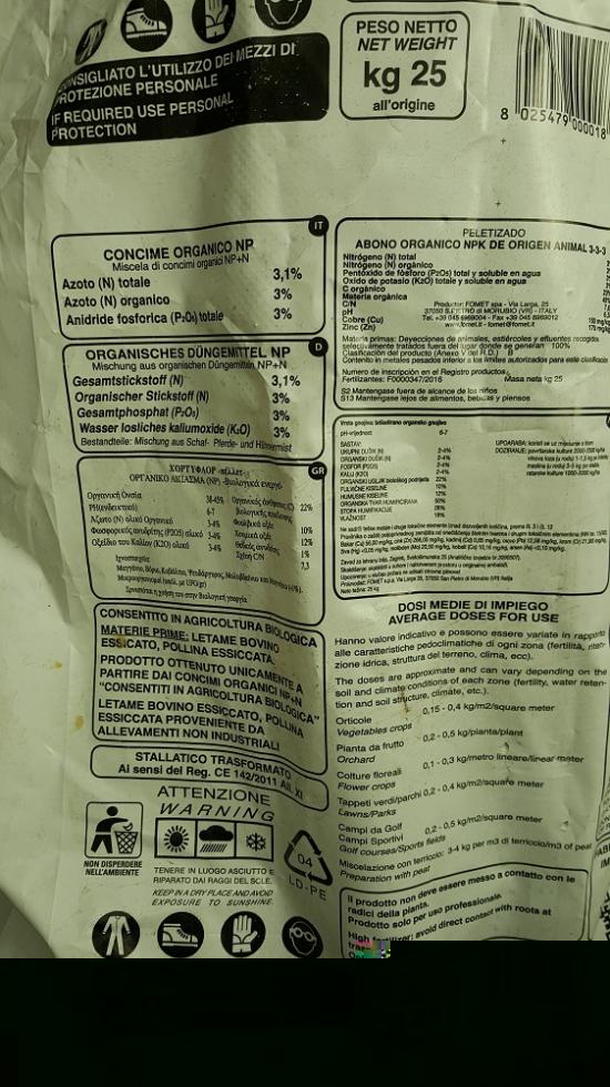 nella foto 1 mostri busta da 25 kg di NP azoto e fosforico organico di letame bovino. se metti calciocianamide aggiungi ancora azoto e troppo azoto non è utile e rischi di spaccare i futuri frutti.