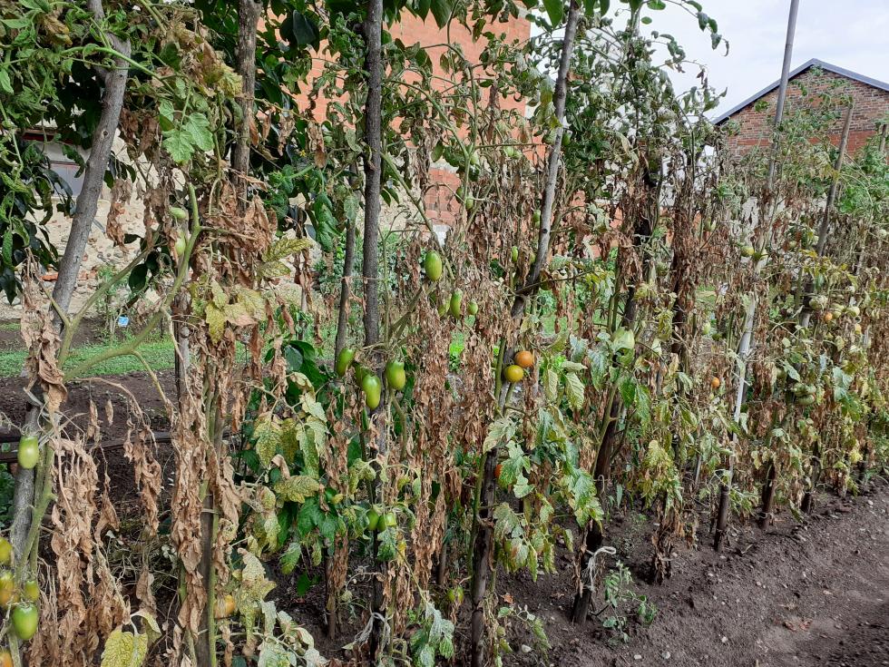 dovresti provare a tenerli coperti i pomodori. io stessa situazione. quelli fuori vanno a farsi benedire. quelli in serra invece stanno bene. unica differenza, non prendono la pioggia.