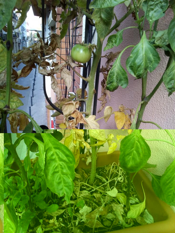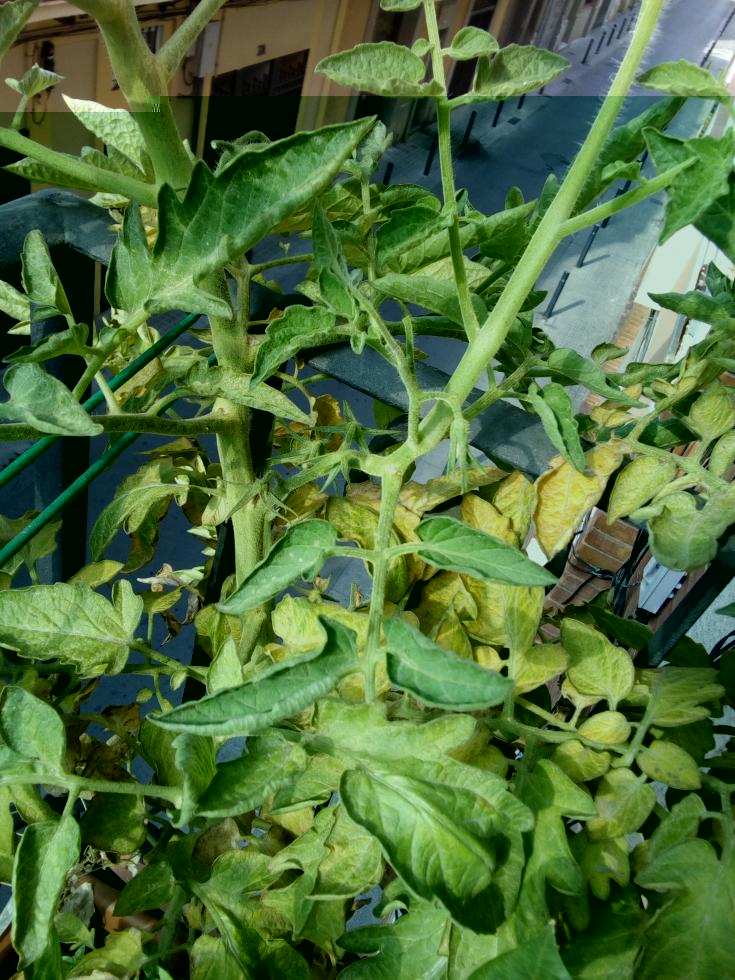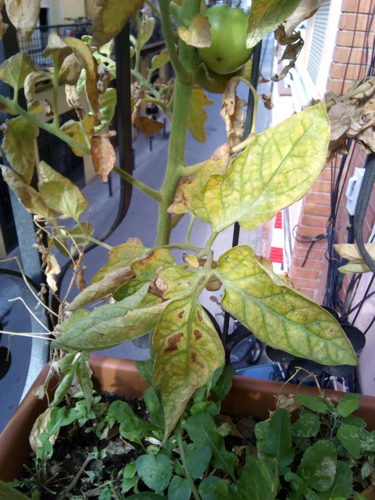 Il mese scorso i pomodori hanno superato il metro e con il caldo tendevano ad appassire e a perdere i fiori, quindi ho aumentato le innaffiature da 2L/giorno a 3-4L/giorno, con acqua di rubinetto quindi relativamente dura. Da 3 settimane circa però, ho notato che le foglie hanno mantenuto l'arricciamento verso l'alto che avevano con lo stress idrico, mentre i rami più bassi hanno iniziato a ingiallire e ora a morire. I 3 pomodori che stavano crescendo sono ancora lì, verdi ma apparentemente sani, ma non stanno crescendo più. Dallo sviluppo dell'ingiallimento ho pensato (cercando in lungo e in largo in internet) che possa essere una carenza di potassio (per via della crescita dei frutti) o di magnesio (per l'ingiallimento intervenale delle foglie e perché sembra che in vaso possano soffrirne), o comunque di qualche elemento mobile, così ho voluto fare di testa mia e ho preparato un brodolone con bucce di patata e di banana (per il potassio), acqua di ammollo dei fagioli (per un poco di fosfato) e 1 fondo di caffè (per l'azoto), lasciata putrefare e irrorato diluita ogni 2 giorni. Non ho notato miglioramenti, il giallo avanzava e anche le foglie verdi superiori mi sembra abbiano un verde meno brillante. Così ho comprato in un growshop una miscela di batteri e funghi terricoli per digerire meglio i residui vegetali dati e formare micorrize, con la "promessa" che in 3 giorni avrei visto quasi dei miracoli...ovviamente dopo una settimana, nada de nada, niet, nisba.
