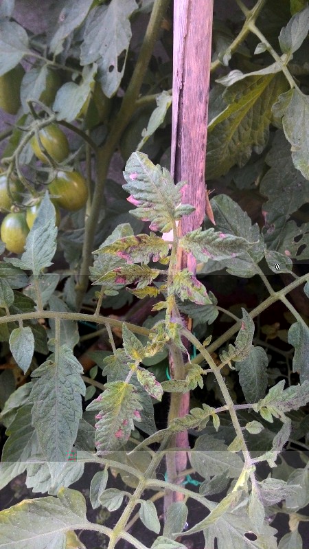 Le mie piante di pomodori datterini, coltivate in grossi vasi, presentano 2 problemi (vedi foto). Chi ha dei suggerimenti utili? Grazie