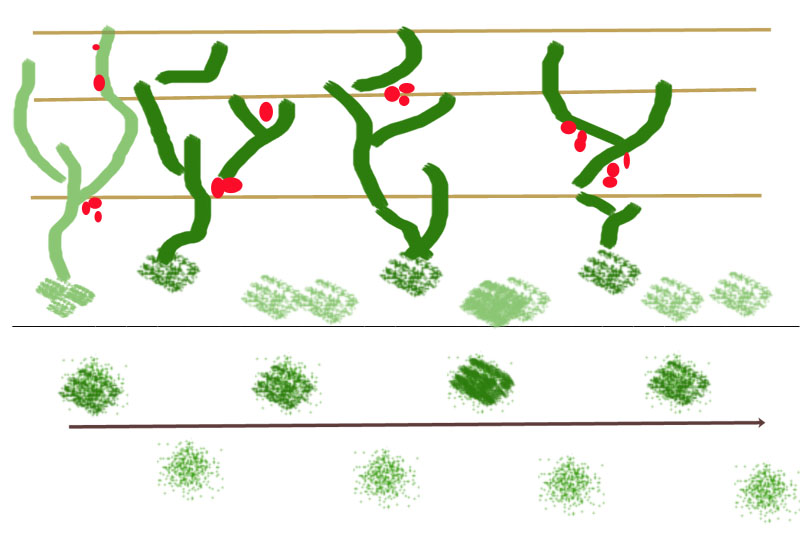 Io invece li metto in fila intervallata parallela, poimetto dei bambu che mi debbono mantenere il filo dove si appoggeranno i pomodori come da disegno