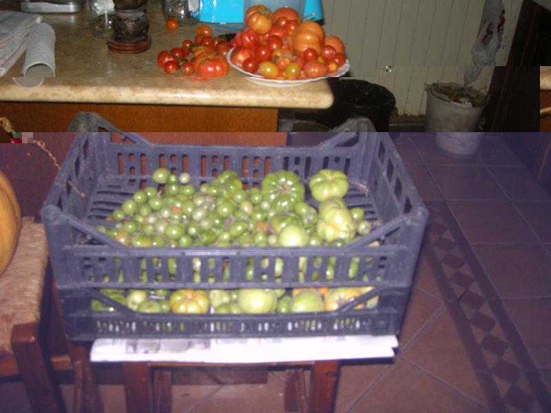 ho deciso di fare un raccolto di tutto, estirpando le piante, e separando i pomodorini quelli ormai spaccati e spappolati da una parte e quelli verdi dall'altra.