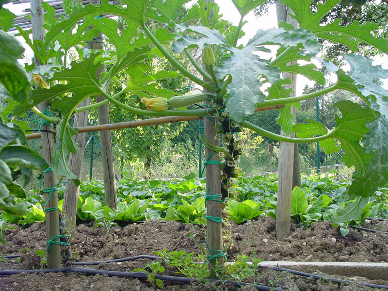 la testa della pianta con le zucchine è pesante, se non legata si può anche spezzare,