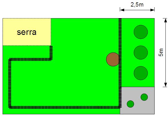 Nella prima immagine allegata è riportato uno schema quotato del mio giardino, il nord è in alto. L'area segnata come "fossa" ospita la fossa biologica nella parte più in alto a sinistra per circa un terzo dell'area. L'area "capanno" è un piccolo capanno di legno con, mio malgrado, tetto in eternit che sarà smaltito al più presto finanze permettendo. Il tondo marrone al centro è il tronco reciso anni addietro di non so quale albero.