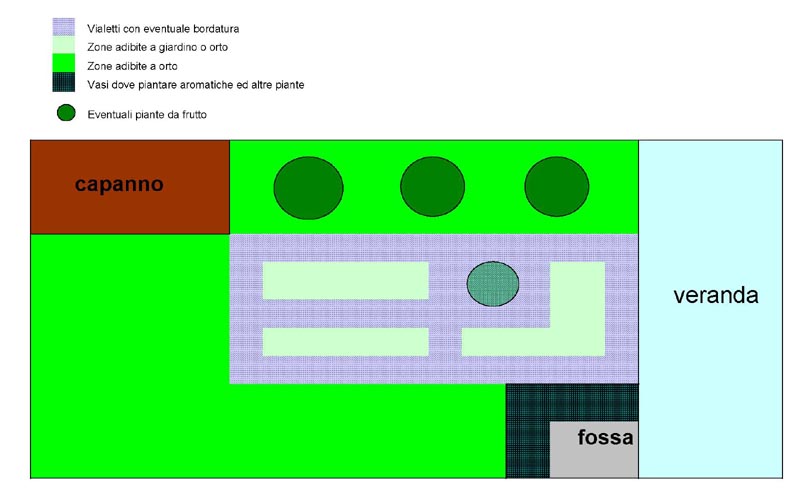 Quel che vorrei fare è realizzare un orticello con qualche verdura e, spazio permettendo, due o tre alberi da frutto. Nella seconda immagine allegata la mia idea disegnata da perfetto ignorante. La linea tratteggiata rappresenta un piccolo steccato "estetico" giusto per delimitare lo spazio. I due tondi nell'area grigia rappresentano una pianta di salvia ed una di rosmarino da piantare il più lontano possibile dal tombino della fossa. I tre tondi verdi al di sopra dell'area grigia rappresentano, nella mia mente piena di immaginazione, tre piante da frutto nane a scelta fra albicocco, melo, pesco, pero, pruno e ciliegio (nemmeno so se esistono tutte queste varietà di piante nane...). Tempo e denaro permettendo, vorrei in futuro realizzare una piccola serra al posto del temibile capanno tossico ora presente.